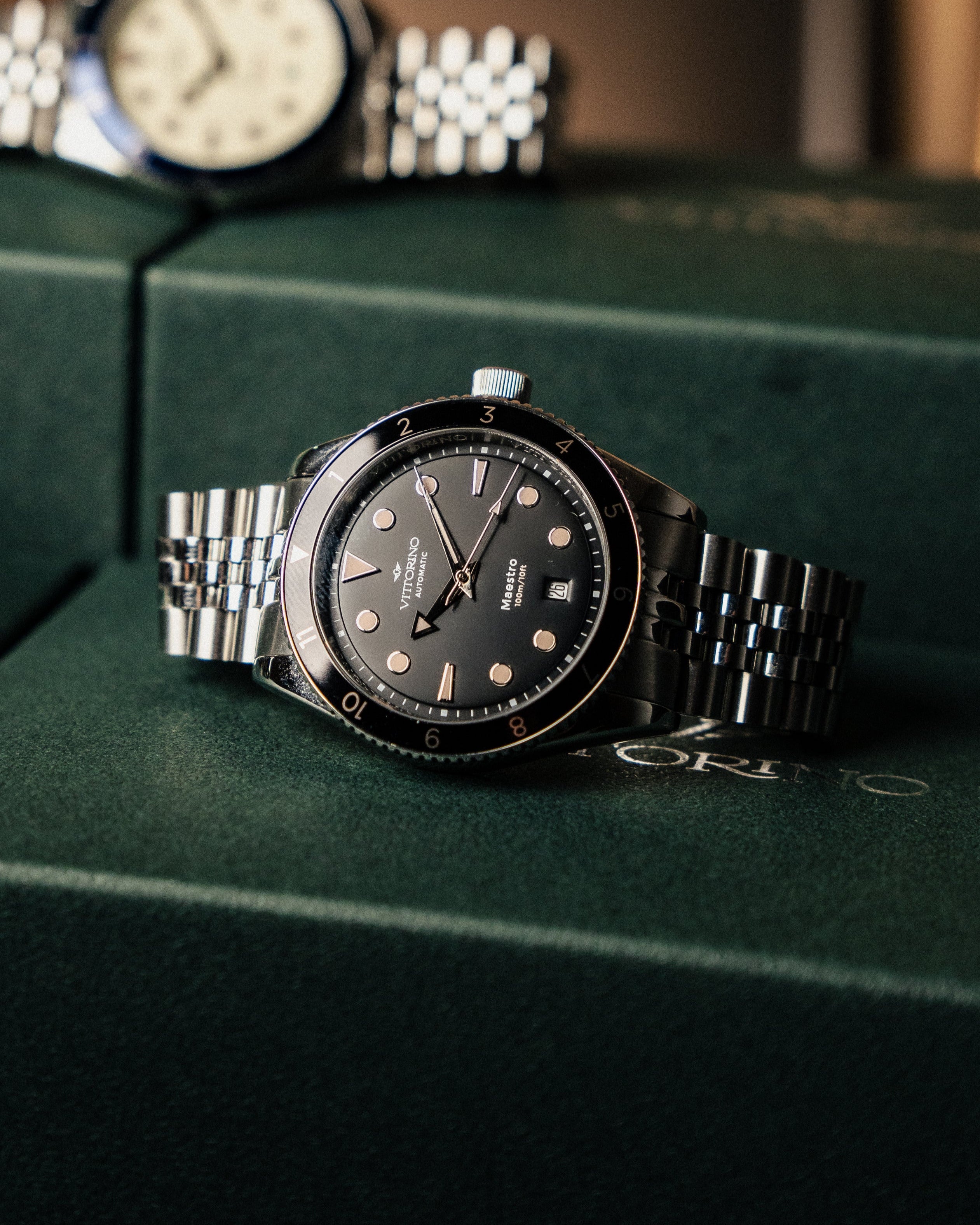 O Onyx da Vittorino é uma celebração da elegância e do mistério. Com seu mostrador preto fosco e a caixa de aço 316L, este relógio combina um design atemporal com uma aura de sofisticação e mistério incomparável.